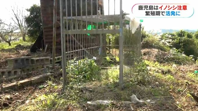 住宅の空き地に設置されたわなです。縦横およそ2メートルの鉄製のおりの中には米ぬかと、イノシシをひっかけるためのワイヤーが設置されています。