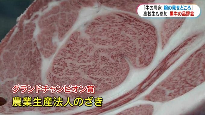 審査の結果、特に肉質が良いと評価された薩摩川内市の「農業生産法人のざき」がグランドチャンピオン賞を受賞。価格は去年と同じで、1キロあたり5000円でした。