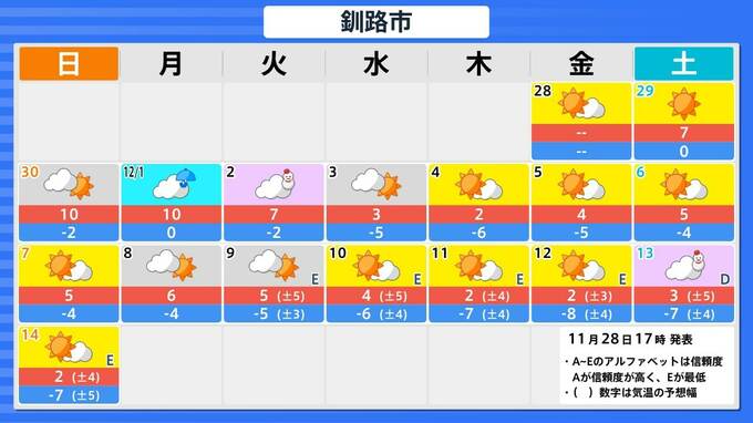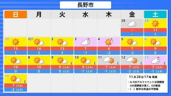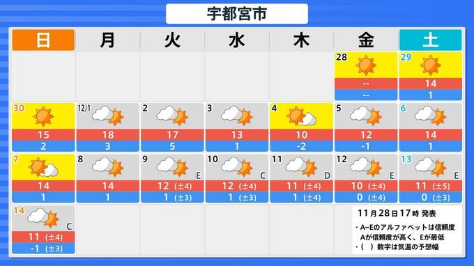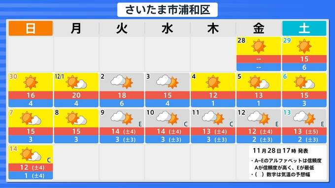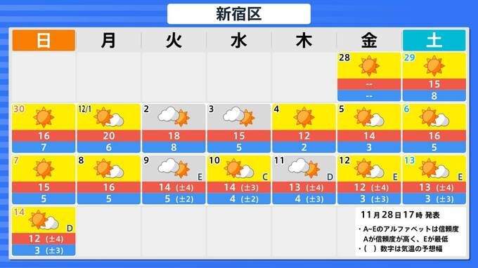 各都道府県の県庁所在地の16日間予報を、画像で掲載しています(北海道は札幌と釧路)。12月4日(木)以降、気温が低く、東京や大阪では最高気温が12℃前後と予想されています。11月最後の土日は、それほど寒くはないため来週の寒さに備えて、冬支度を進めておきましょう。
