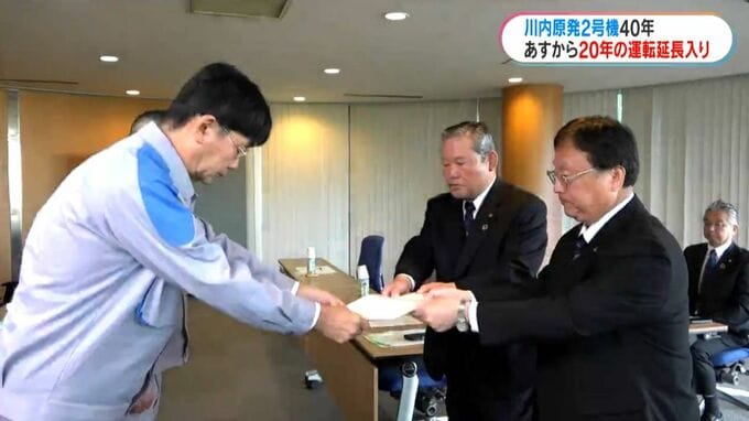 川内原発2号機は1985年に運転を開始し、28日で40年となります。田中市長は下園政喜議長とともに、川内原子力総合事務所の大久保康志所長に要望書を手渡しました。