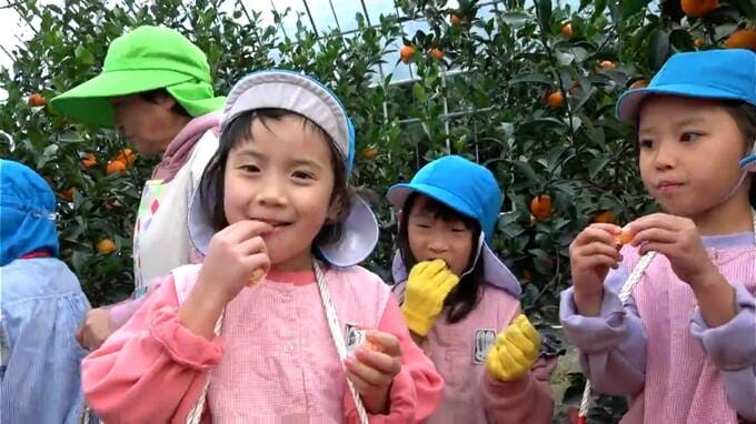 テープカットの後、小みかんを育てている坂元克明さんが、近くにある桜島こども園の園児らと一緒に、きれいなオレンジ色に実った桜島小みかんを収穫していました。