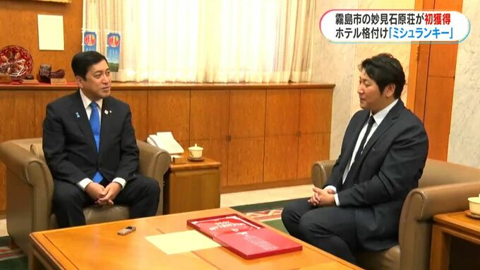 霧島市の妙見石原荘が、ホテル版の格付け「ミシュランキー」を今年初めて獲得し、塩田知事に報告しました。認定の連絡は突然でした。