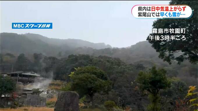 山は雪、足湯で紅葉、南の島ではまだ半袖… あす4日はさらに冷え込み 鹿児島県 2025年12月3日(水) 19:13 国内 午後3時半ごろの、霧島市牧園町。早くも雪がちらつきました。 また、さつま町と出水市にまたがる標高1067メートルの紫尾山にも雪が舞い、地面が白くなっていました。 「わっぜ寒い。これから積もりそう」