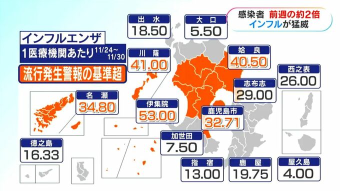 保健所別では、▼伊集院で53.00人、▼川薩で41.00人、▼姶良で40.50人、▼名瀬で34.80人、▼鹿児島市で32.71人と、県内5つの保健所で「流行発生警報」の基準となる30人を超えています。