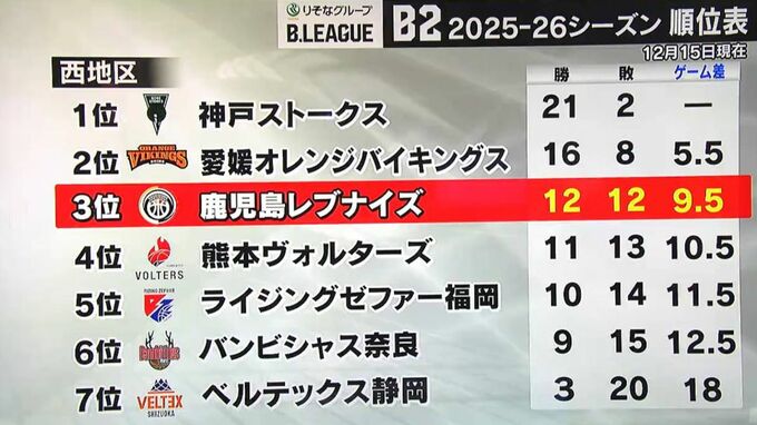 順位表です。勝率を五分に戻したレブナイズは西地区3位。