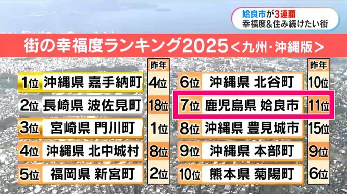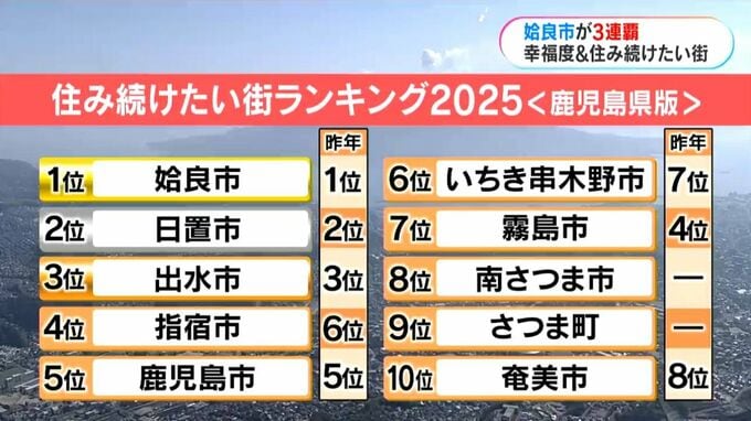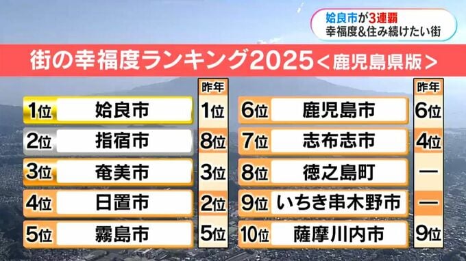 鹿児島県内の「街の幸福度」では、1位が3年連続で姶良市、2位は指宿市で去年の8位から大きく順位を上げ、3位は奄美市でした。