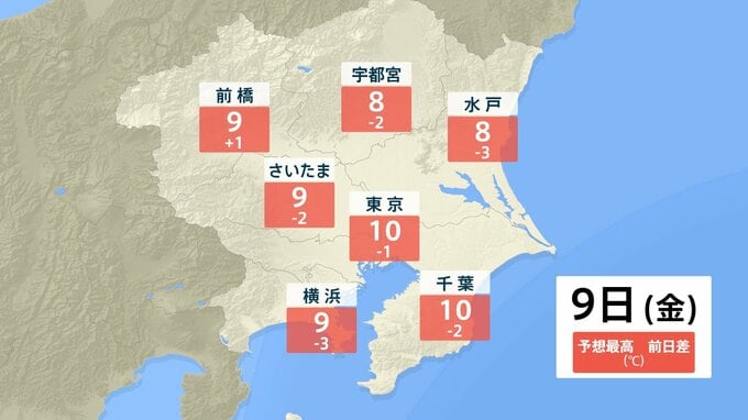 最高気温は8日(木)より2℃ほど下がり、日中は10℃を超えないところがほとんどでしょう。