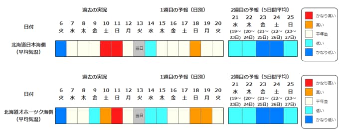北海道地方の気温は、向こう1週間程度は平年並の日が多いですが、その