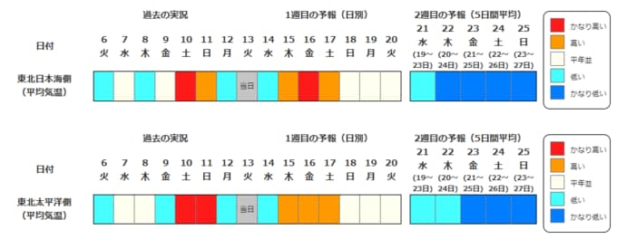 東北地方の気温は、向こう6日間程度は寒気の影響を受けにくいため平年