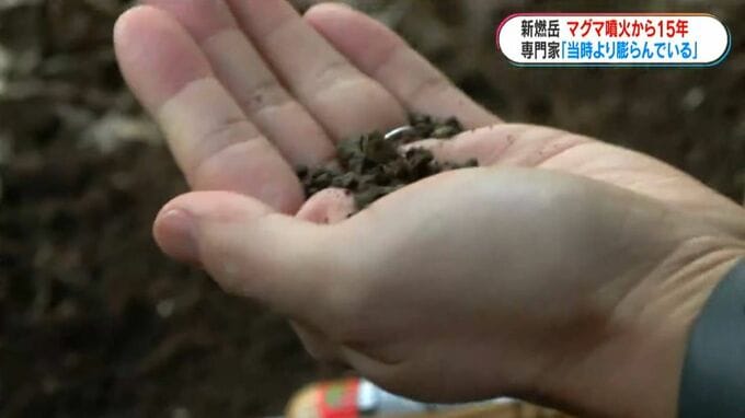 (記者)「2011年の噴火で出た軽石です。触るとザクザクしていて、手に持ってみるととても軽い感じがします」