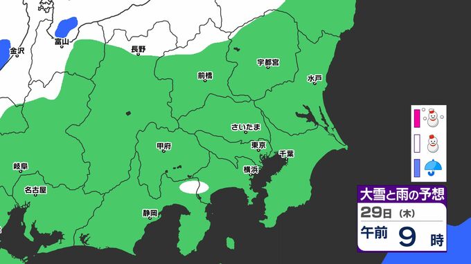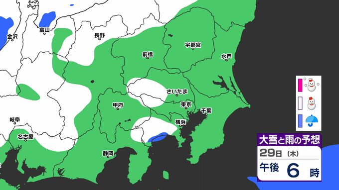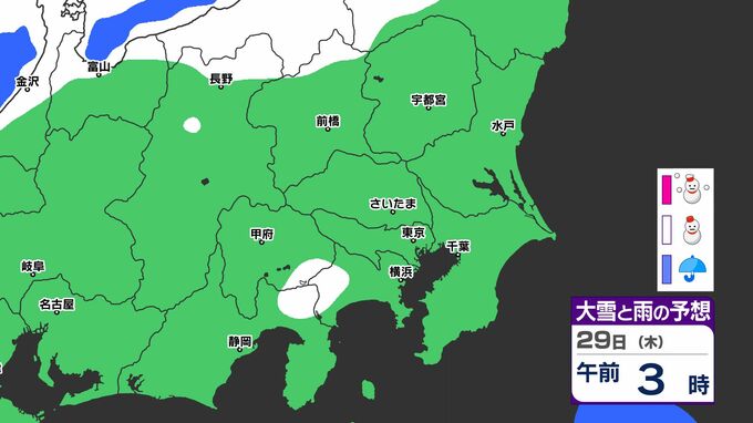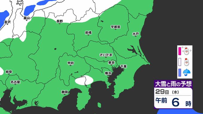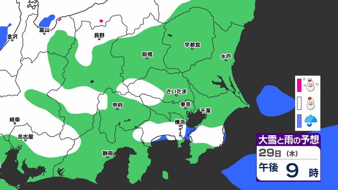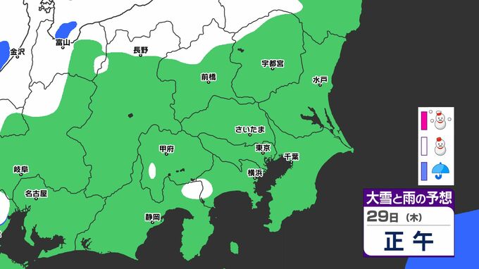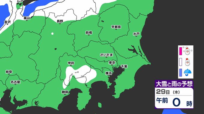 「雪」は関東地方の北部や長野県が中心ですが、29日(木)には山梨県、神奈川県、東京都、埼玉県にも「雪」の範囲が広がる見込みです。雪シミュレーションでは画像で確認できます。