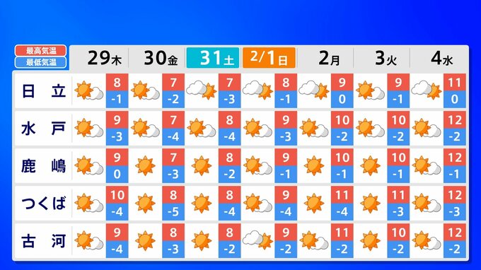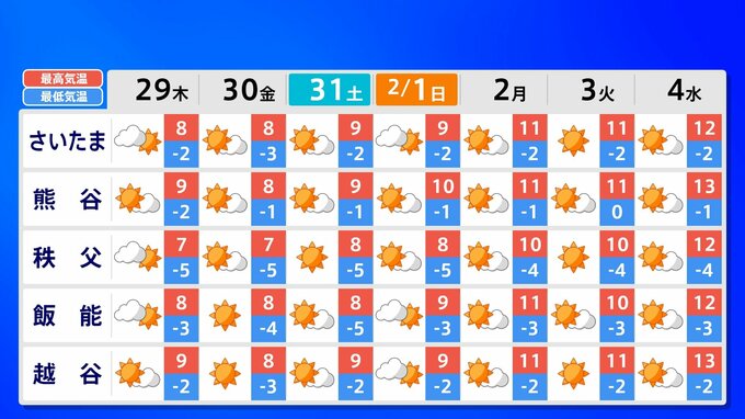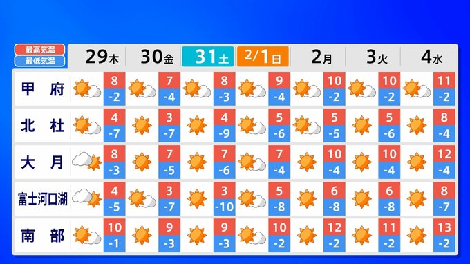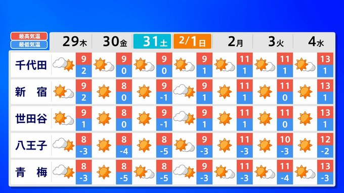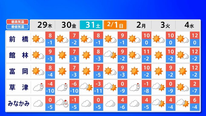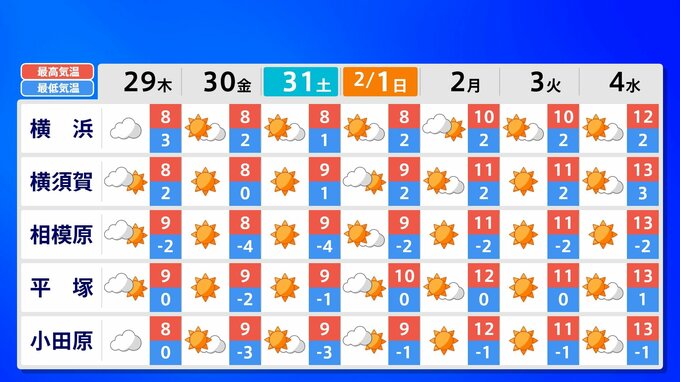 【東京首都圏 雪?】木曜・金曜「強い寒気南下」東京・神奈川・埼玉で雪の予想【雪のシミュレーション29日(木)~2月2日(月)】/ 関東各都市の週間予報】東京・神奈川・埼玉・千葉・群馬・茨城・栃木・山梨・長野 2026年1月27日(火) 12:10 国内 天気 関東甲信地方 各都市の週間予報(29日(木)~ 2月4日(水)) 週間予報を画像で掲載しています(各都県5か所ずつ)。神奈川県の場合、横浜市・横須賀市・相模原市・平塚市・小田原市です。2月4日(水)は「立春」、暦の上では「春」になりますが、まだまだ寒さは続きそうです。 この記事をはじめから → 【東京首都圏 雪?】「雪シミュレーション」