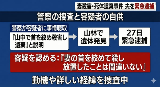 取り調べに対し豊容疑者は「妻の首を絞めて殺し放置したことは間違いない」と容疑を認めているということで、警察が動機や詳しい経緯などを調べています。