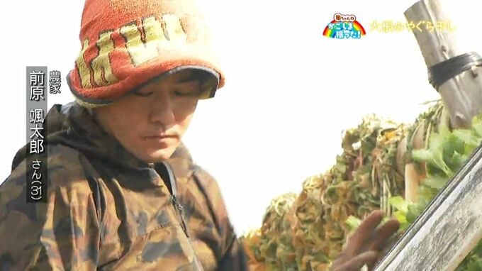 撮影させていただいた南九州市の農家、前原颯太郎さん。冬は日も短いために、手際よく、そして黙々と大根を干していらっしゃいました。