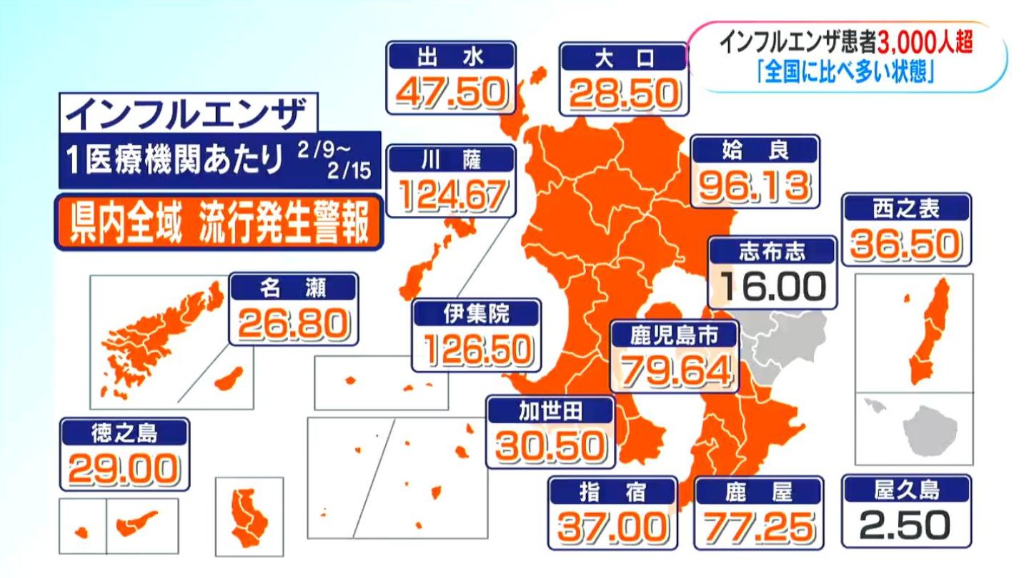 感染が拡大しているインフルエンザ。鹿児島県は19日、新たな患者数を発表し、1週間に確認された患者は2週連続で3000人を超えました。