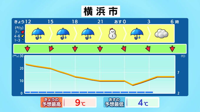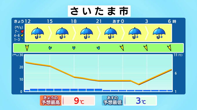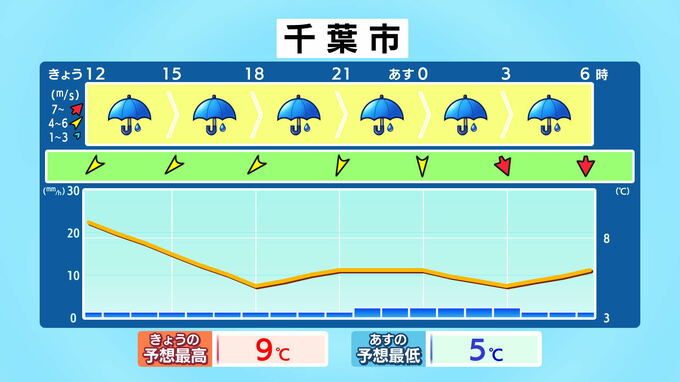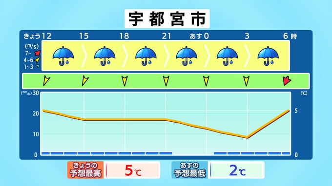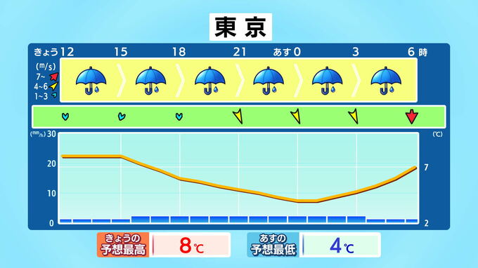 3日(火)は、「最高気温はひとケタ」「強風のため気温以上に寒い」「夜は冷え込む」見込みです。「寒の戻り」で寒いため、きょうは真冬の装いでお過ごしください。東京の予想最高気温8度で、2日(月)よりも5度も下がりそうです。