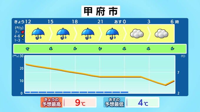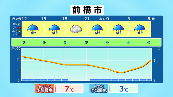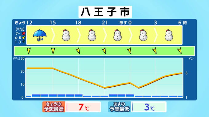 主要都市(東京都心・八王子市・横浜市・さいたま市・千葉市・前橋市・宇都宮市・水戸市・甲府市・長野市)の3時間ごとの予想です。