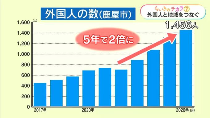これは鹿屋市に住む外国人の数を示したグラフです。今年は1456人でここ5年でおよそ2倍に増えました。
