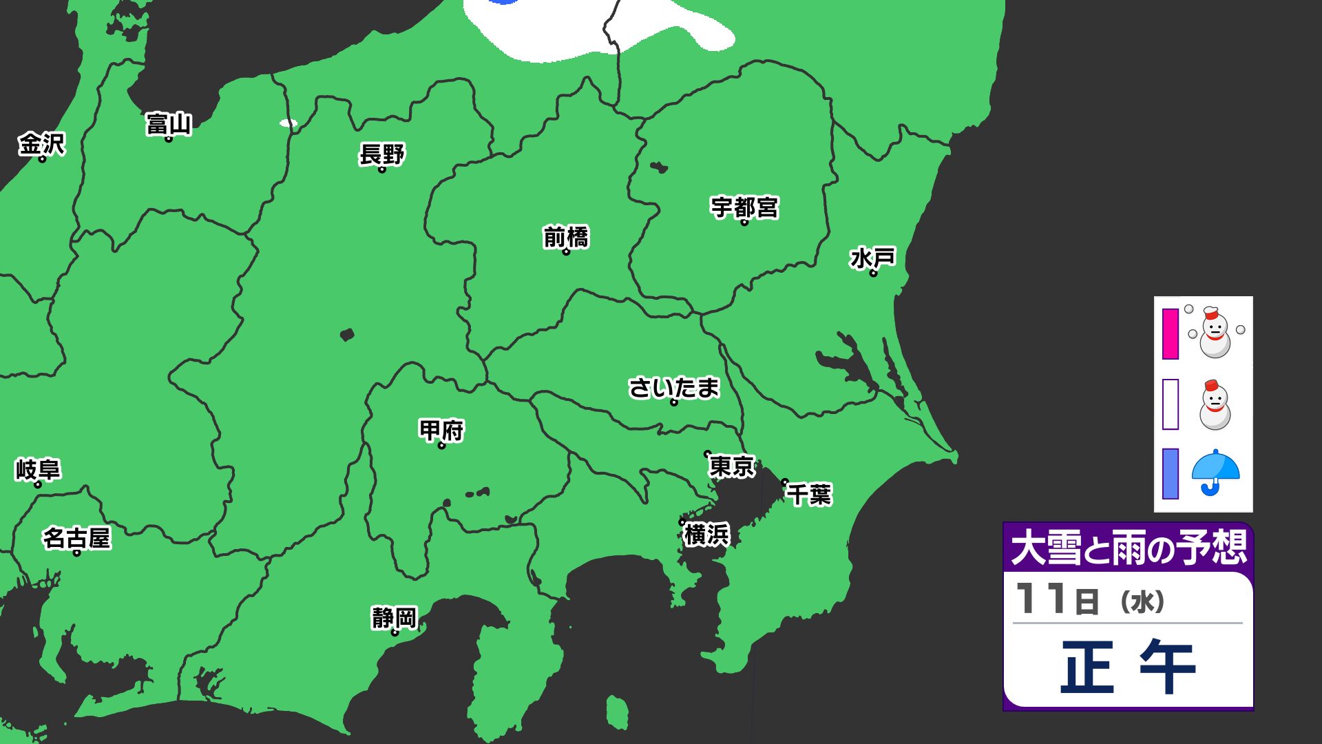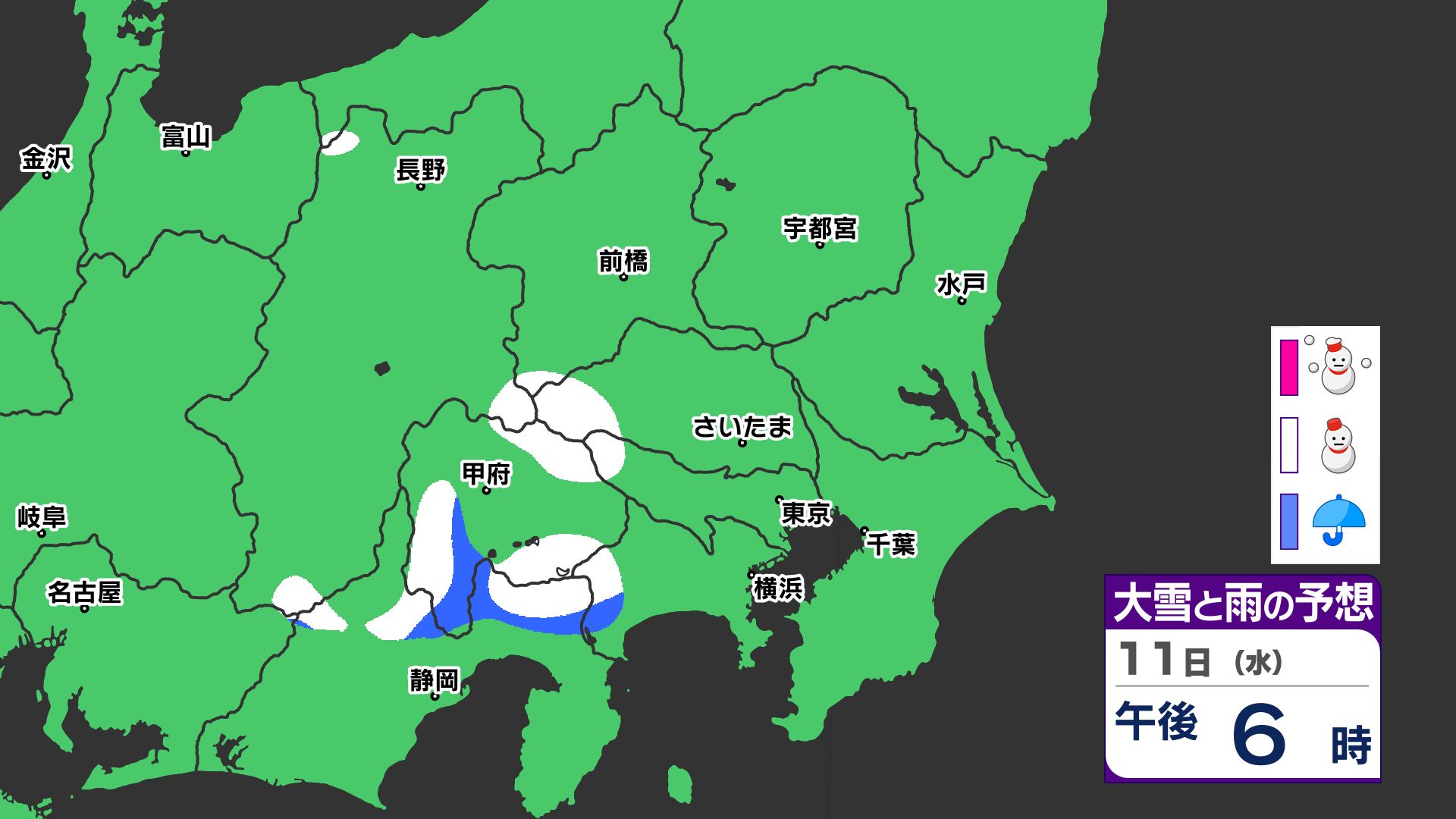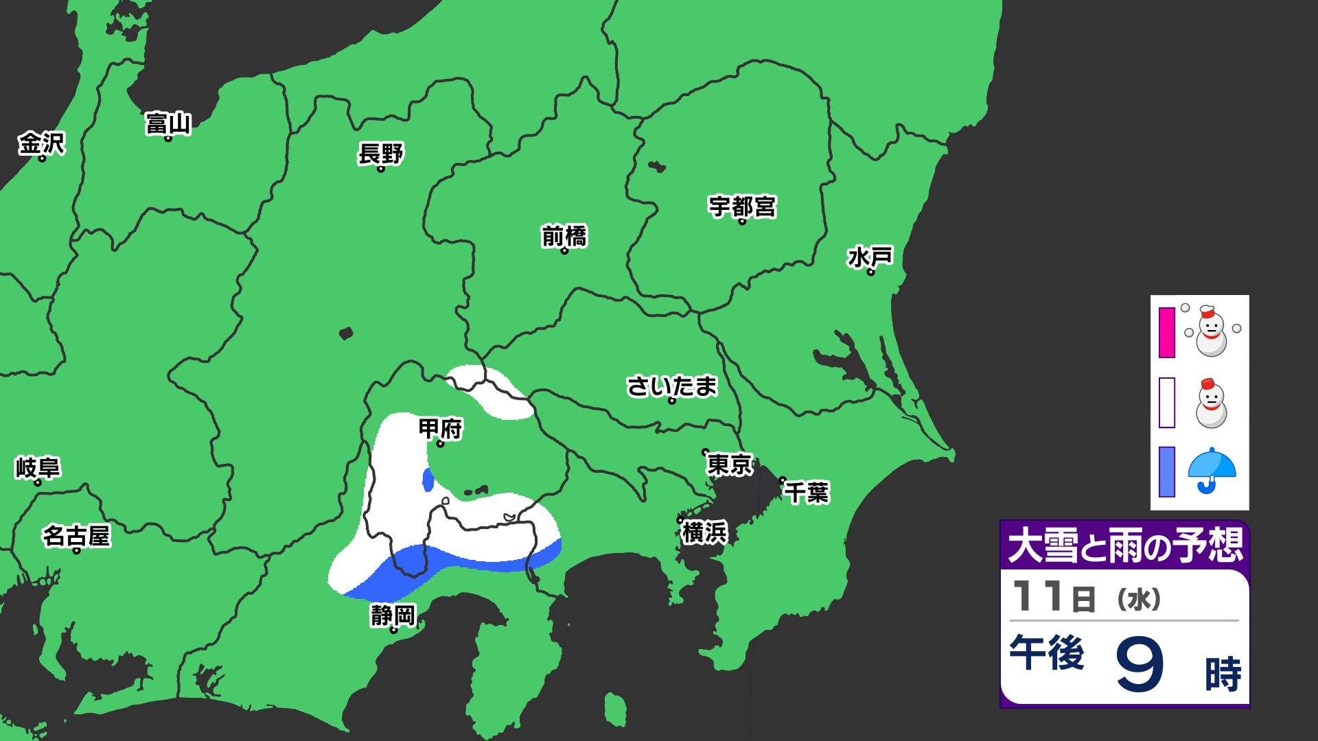 【東京首都圏 今夜 雪か?】今週 寒の戻り「雪が舞う日も」【雪シミュレーション9日(月)~14日(土)】/ 関東各都市の週間予報】東京・神奈川・埼玉・千葉・群馬・茨城・栃木・山梨・長野 2026年3月9日(月) 11:19 国内 天気 11日の雪・雨シミュレーション 東京、山梨、埼玉など一部で雪予想