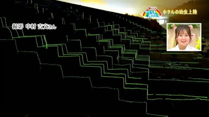 これは3時間かけて撮影した、幼虫の光の跡です。幼虫の姿からは想像できないきれいな光ですよね。