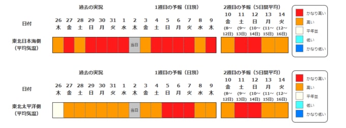 東北地方の向こう2週間の気温は、暖かい空気が流れ込みやすいため、かなり高い日が多い見込みです。