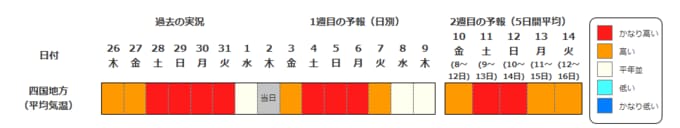 四国地方の向こう2週間の気温は、暖かい空気が流れ込みやすいため高い日が多く、5日頃と9日頃からはかなり高くなる見込みです。