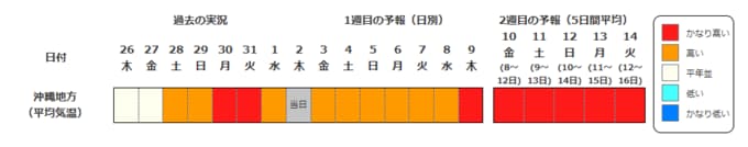 沖縄地方の向こう2週間の気温は、暖かい空気が流れ込みやすいため高く、8日頃からはかなり高くなる見込みです。