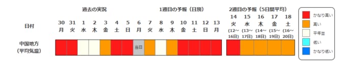 中国地方の向こう2週間の気温は、暖かい空気が流れ込みやすいため高い日が多く、10日頃からはかなり高くなるでしょう。