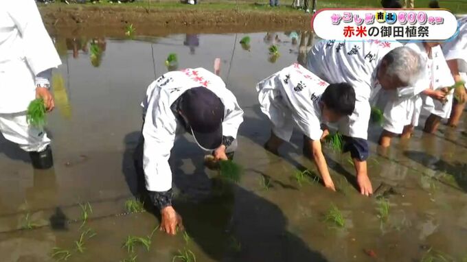 神事のあと神主が田んぼをお祓いし、小学3年以上の子供たちと関係者が、御田植の太鼓と歌に合わせて田植えをしました。