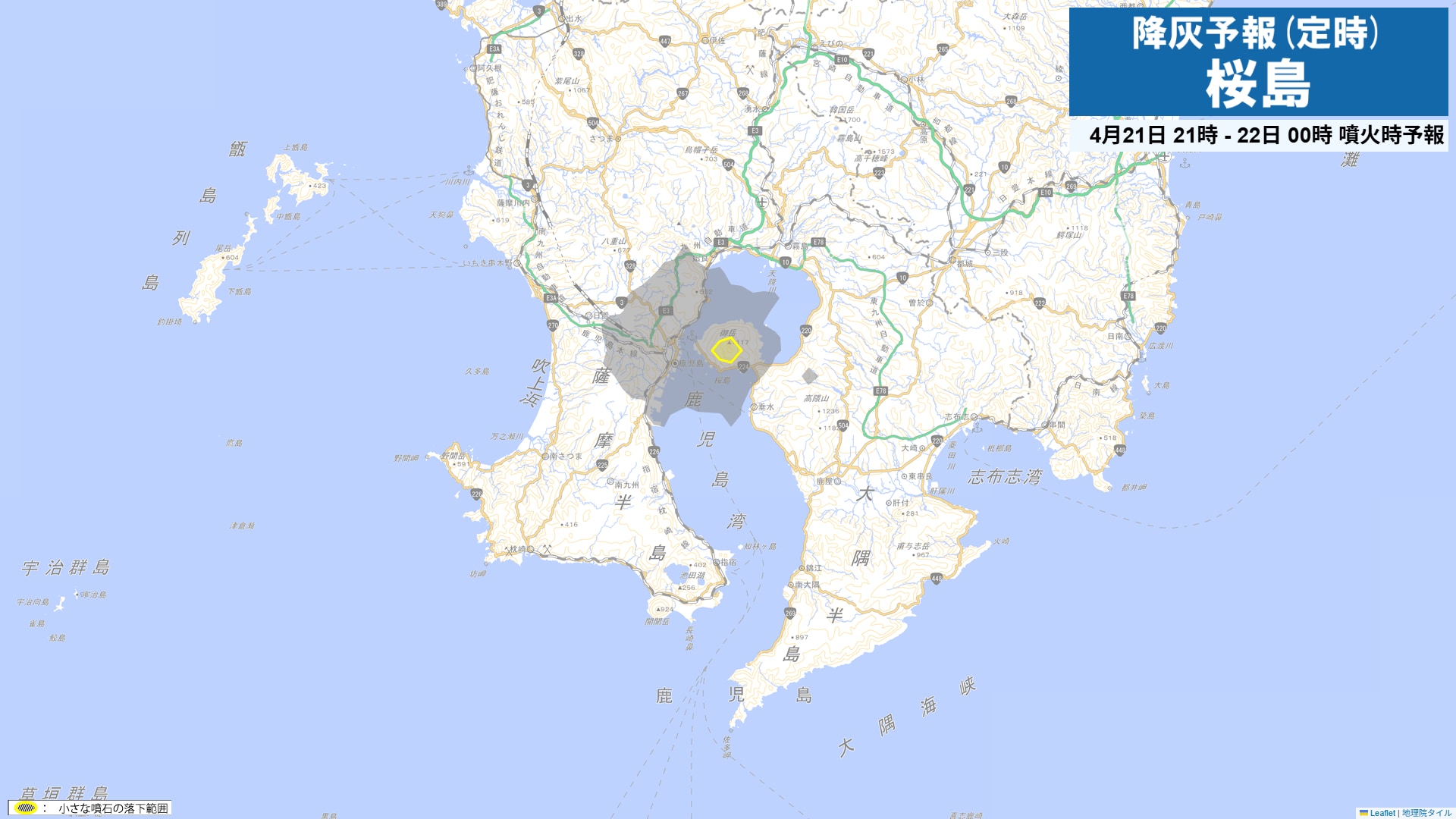 21日12時から22日6時までに噴火が発生した場合には、以下の方向・距離に降灰及び小さな噴石の落下が予想されます。