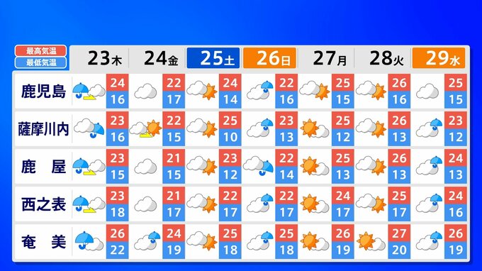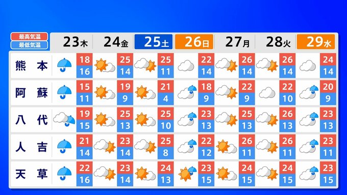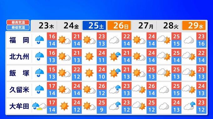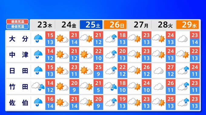 【警報級大雨】低気圧 九州通過 23日(木)「荒れた天気」【雨と風シミュレーション22日(水)23日(木)】福岡・佐賀・長崎・大分・熊本・宮崎・鹿児島 2026年4月21日(火) 20:00 国内 天気 九州地方 各都市の週間予報(23(木)~ 29日(水祝)) 23日(木)は雨のため気温が上がらず、寒いので服装に気を付けましょう。また24日(金)以降は九州北部では晴れる所ですが、29日の祝日は「雨」の予報が多くなっています。 この記事をはじめから →【九州 警報級大雨のおそれ】雨風シミュレーション