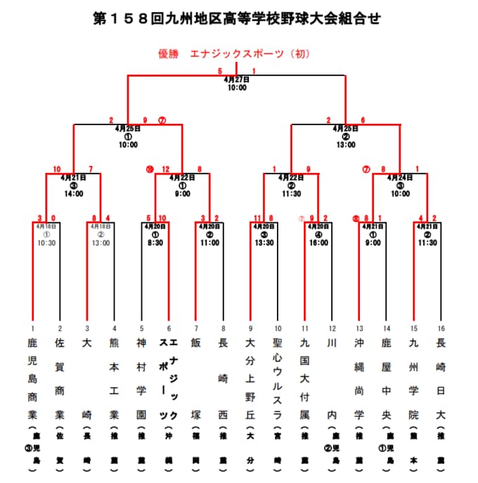 エナジックスポーツが初優勝 九州高校野球決勝で沖縄尚学を下す【九州地区高等学校野球大会2026】 2026年4月27日(月) 12:52 国内 鹿児島市で開かれている第158回九州地区高等学校野球大会は、27日決勝戦があり、エナジックスポーツと沖縄尚学のいずれも沖縄代表が戦いました。 試合の結果、 エナジックスポーツ 5 ー 1 沖縄尚学 で、エナジックスポーツ高等学院が初優勝しました。