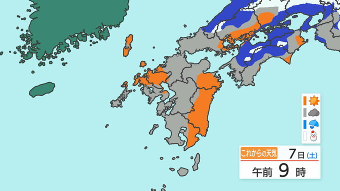 7日午前0時ごろには九州のほとんどが雨のエリアになる予想です。雨は未明から明け方まで続く予想です。