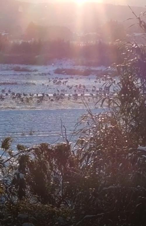 午前8時15分ごろの伊佐市です。撮影した51歳の男性によりますと、「伊佐市の田んぼに鶴が来ています。約100羽はいます。」とのことです。