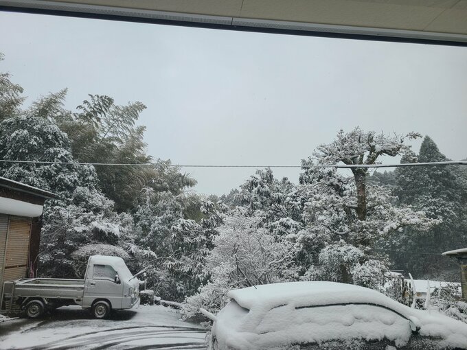 伊佐市の「パン屋さんにはジャムを持参」さんから。24日12時半ごろ「みるみる積もりだしました」。伊佐市は急に雪の勢いが強まった時間帯があったようです。