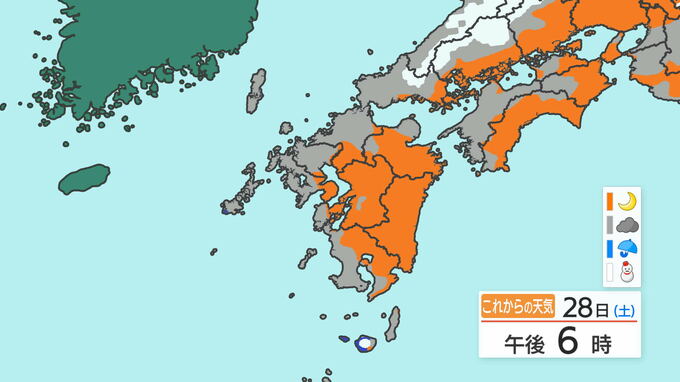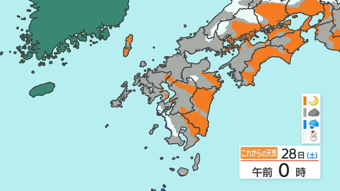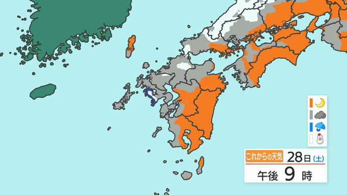 28日夜には九州北部の福岡、長崎、佐賀などにも雪のエリアが出てくる予想です。29日早朝からは、鹿児島、熊本、宮崎の一部に雪が予想されています。
