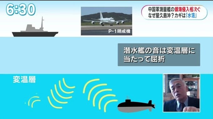 (元海自・潜水艦隊司令官 矢野一樹さん)「潜水艦の音波は変温層に当たって屈折する。変温層に入った潜水艦は探知できない」