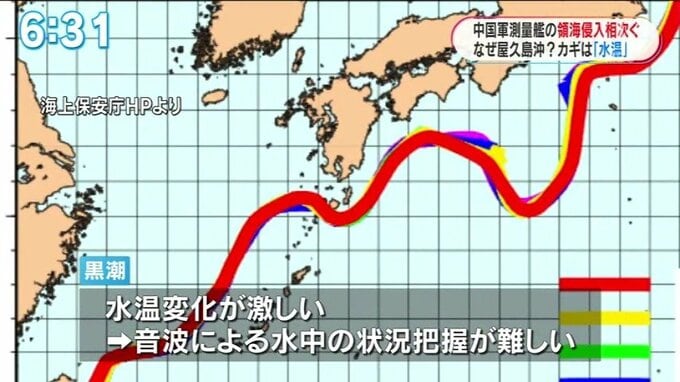 元潜水艦隊司令官の矢野さんは、屋久島沖は変温層に加えて黒潮が流れるため、「中国海軍にとっては潜水艦が探知されにくい海域」だといいます。