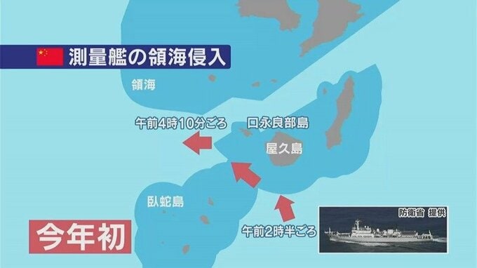 防衛省によりますと、12日午前2時半ごろ、中国海軍の測量艦1隻が、屋久島南西の日本の領海に侵入。中国測量艦はその後、北西方向に進み、午前4時10分ごろ十島村・口之島の北東の日本の領海を出て、西に航行しました。