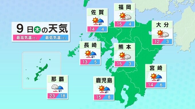 8日(水)九州は晴れましたが、あす9日(木)は低気圧と前線が近づき、雨が降りだすところが出てくるでしょう。9日(木)、お帰りが夜になる方は、朝出かけるときに雨が降っていなくても、傘を持って出かけましょう。