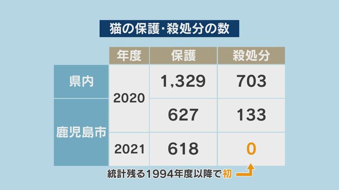 鹿児島県内では、2020年度、1,329匹のネコが保護され、そのうち703匹が殺処分されました。鹿児島市では保護された627匹のうち133匹が殺処分されました。しかし、2021度は前年度とほぼ同じ618匹が保護されたなか、殺処分は行われませんでした。統計が残る1994年度以降で、ネコの殺処分ゼロは初めてのことでした。
