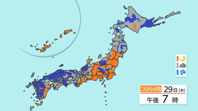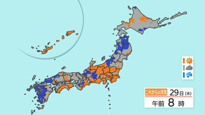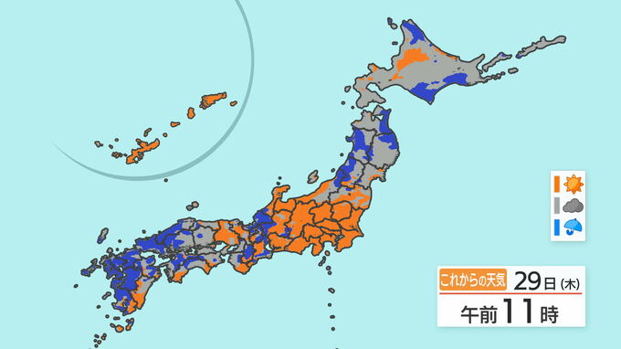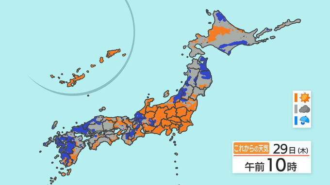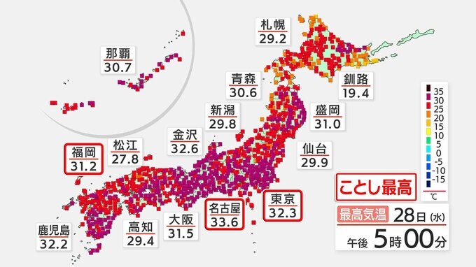 南の海上にある高気圧から暖かい空気が流れ込み、日射も加わって、28日は暑い一日となりました。東京・名古屋・福岡で今年一番の暑さ、札幌と鹿児島で、今年2番目に暑い日となりました。29日の東京は、より高い最高気温33℃が予想されています。