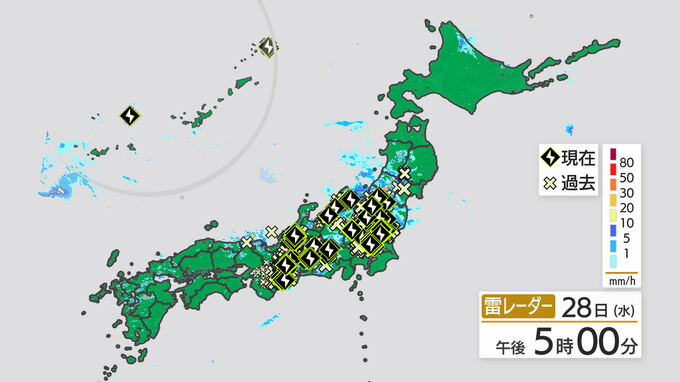 大気の状態が不安定なため、各地で雷雲が発生しました。28日午後5時の”雨雲レーダー”と、雷の様子を示す”雷レーダー”を見ると、局地的に積乱雲が発達し、雷が発生した様子がわかります。解析雨量では、富山県や熊本県で、時間雨量80ミリの猛烈な雨が降ったとみられます。