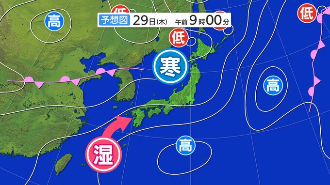 大気の状態が不安定な状況は、29日も続きます。南の太平洋高気圧から送り込まれる暖かく湿った空気のため、地上の気温が高くなります。また上空には、-9℃以下の今の時季としては強い寒気が流れ込んでくる見込みです。