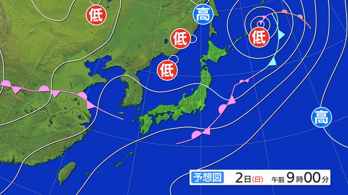 2日(日)は、上空に乾いた空気が入り、前線が活動を弱めます。そのため、梅雨前線は途切れてしまう見込みです。