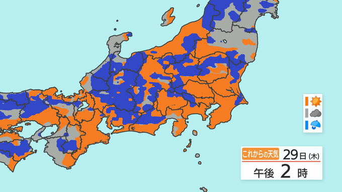 下の天気シミュレーションでは、関西から関東、東北の一部で、晴れを示すオレンジ色のエリアや、雨を示す青のエリアが混在しています。