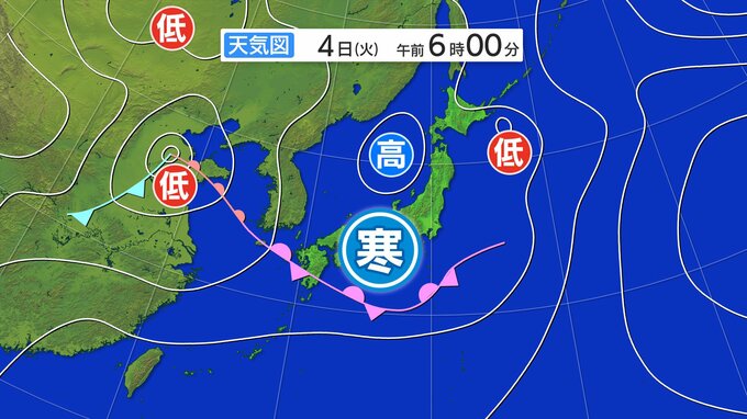 上の天気図では、関東地方や東海地方の上空約6000メートルに、氷点下9℃以下のこの時期としては、強い寒気が流れ込んでいます。