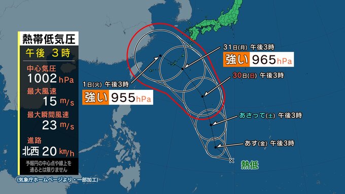 日本の南の海上の熱帯低気圧は、今後台風6号へと発達する見込みです。予報円の中心を進んだ場合、31日(月)午後3時には沖縄・那覇市の東およそ100キロに達する見込みです。