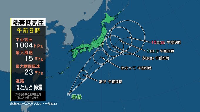 熱帯低気圧は今後24時間以内に台風となる見込みで、7日15時には八丈島の南南西約100キロを中心とする予報円内に達する見込みです。