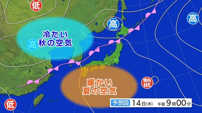 前線が南下すれば、秋の空気に覆われ涼しくなり秋の訪れとなるでしょう。